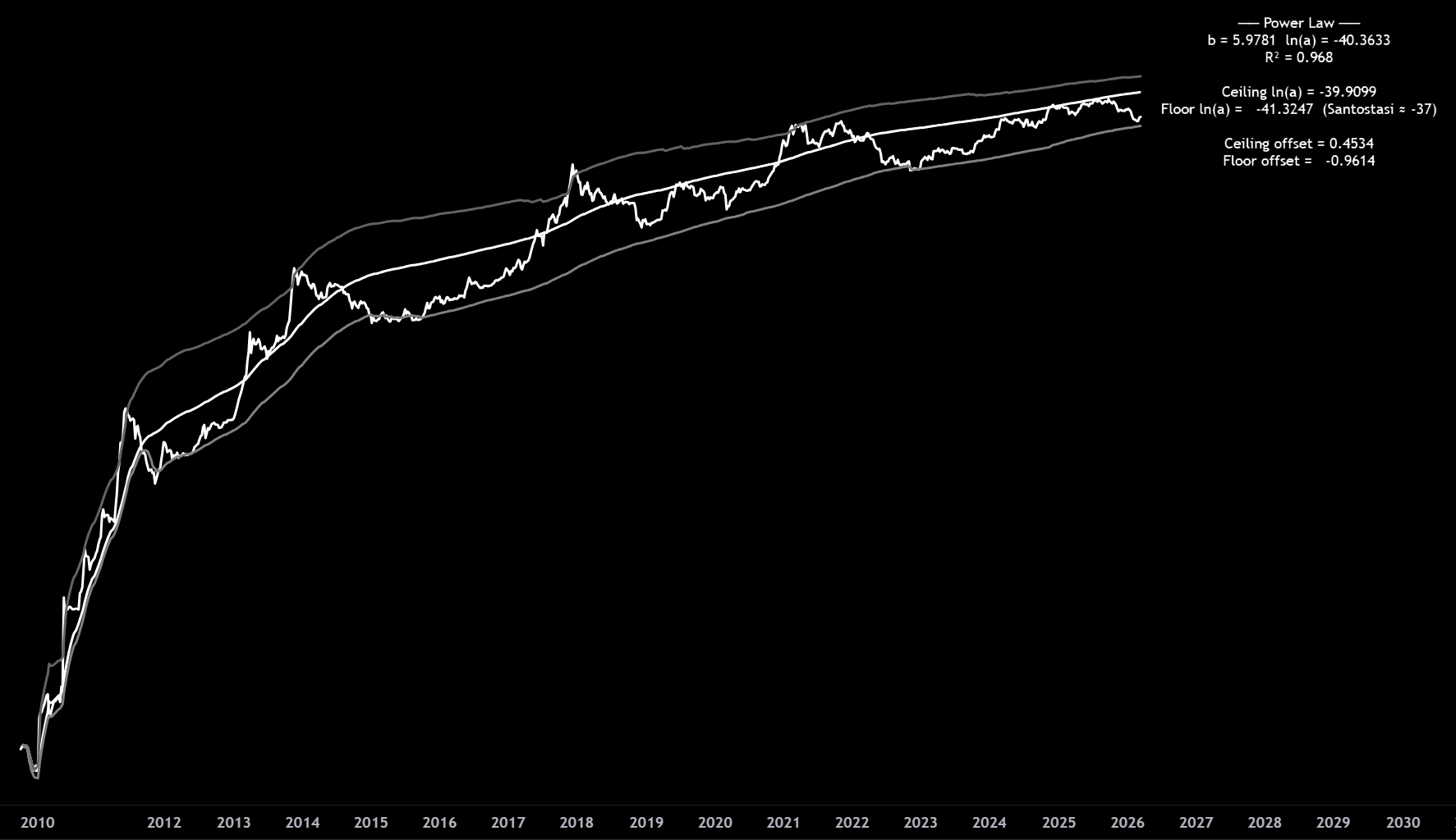 R² = 0.968 means the power law model explains 96.8% of the variance in log(price) over the full history. This is measured in log-log space, which is the correct space for evaluating a power law fit.